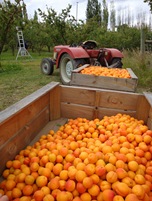 La récolte des cerises et des abricots se fait de la même manière, prenez un grand sac en le portant à l’envers pour avoir la poche devant puis vous essayez de ramasser les fruits murs, enfin, pas trop non plus sinon ça vous fait de la confiture dans la benne. Vous videz ensuite votre sac dans une benne qui va accueillir quelques centaines de kilos de fruits.